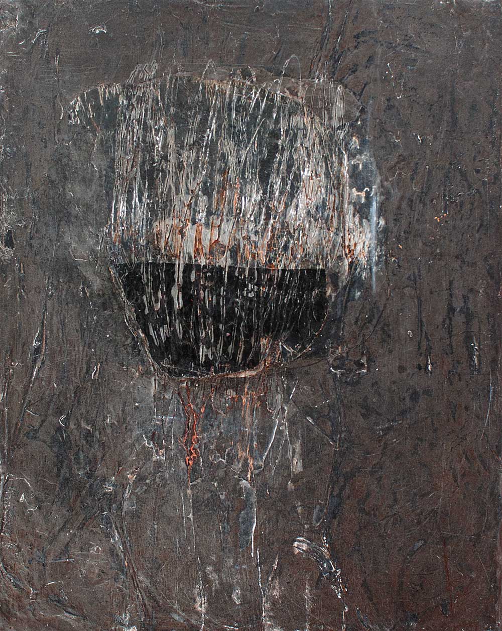 Pigmente, Marmor-, Talkum-, Spinell-, Schiefermehl, Bleistiftton, Japanpapiere, Wachs und Acryl auf Leinwand
