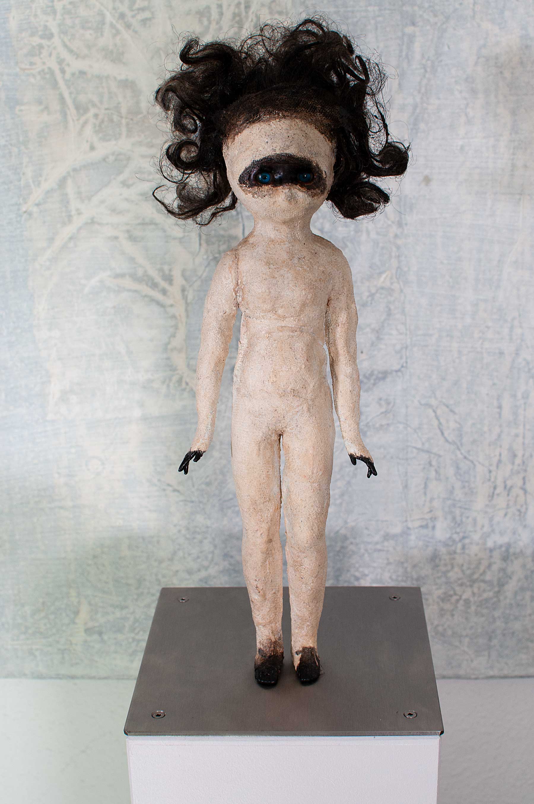 überarbeitete Kunststoffpuppe mit Holz, - Papier, - und Tonmehlen, Wachs, Baumwollmull, Asphaltlack, Bitumen