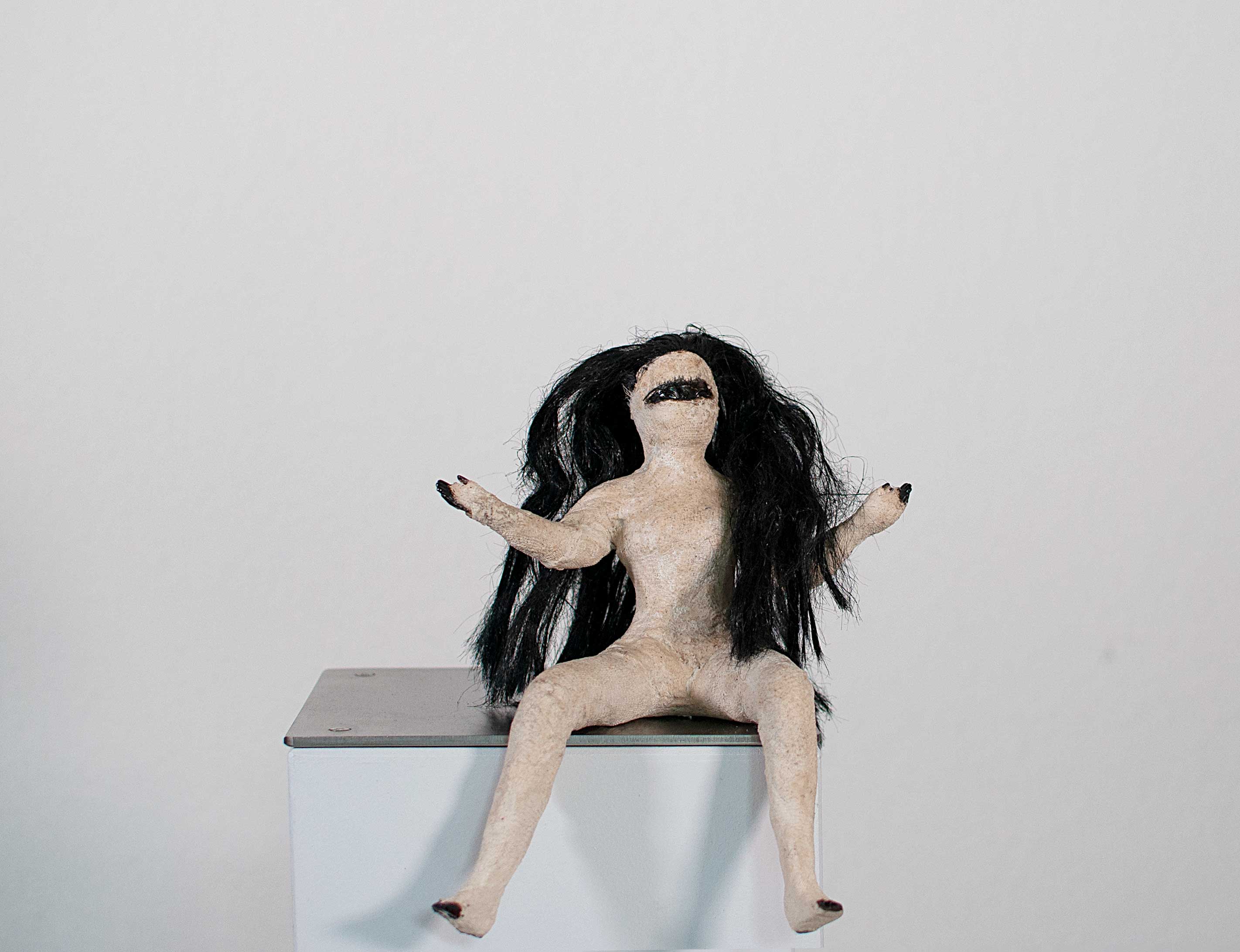 überarbeitete Kunststoffpuppe mit Holz, - Papier, - und Tonmehlen, Wachs, Baumwollmull, Asphaltlack, Bitumen