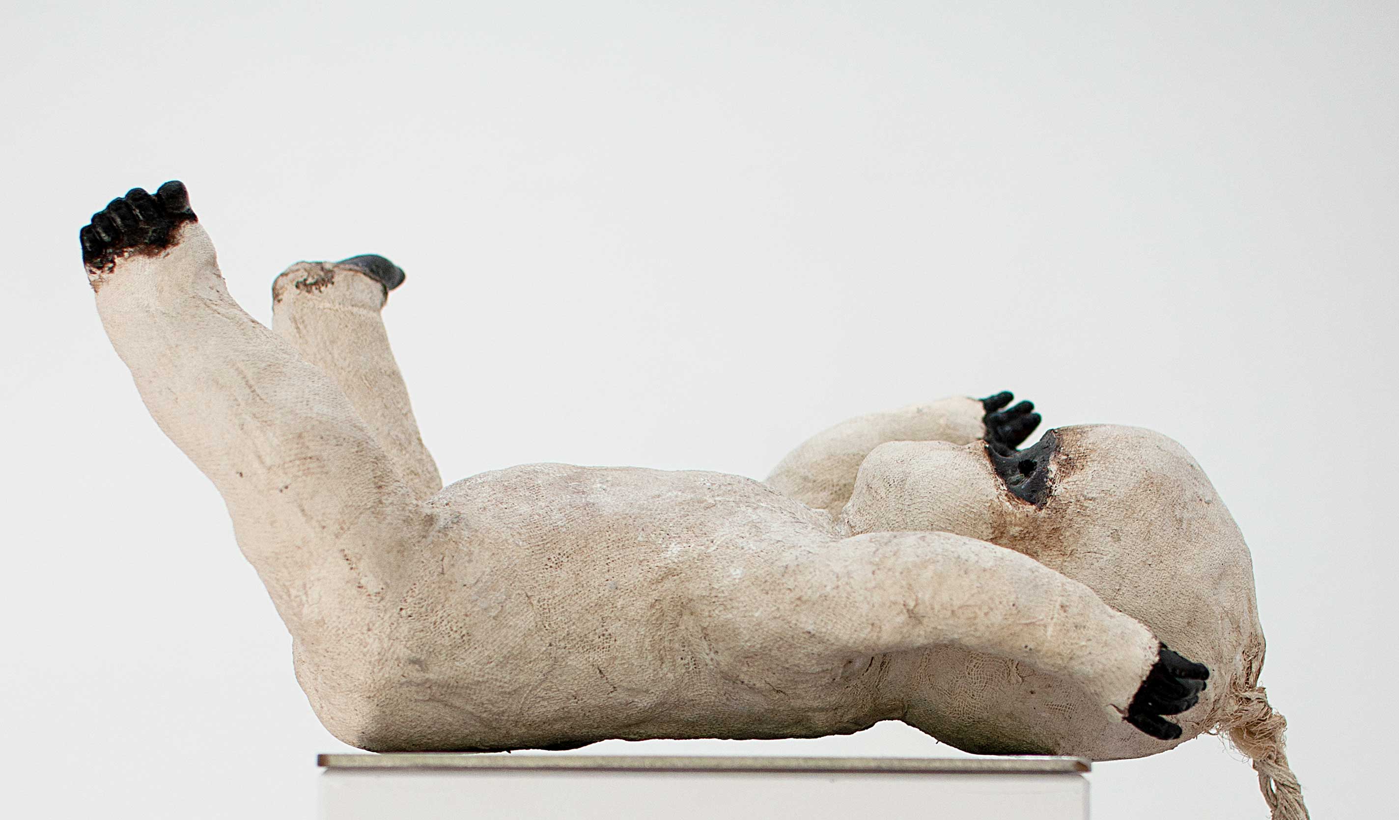 überarbeitete Kunststoffpuppe mit Holz, - Papier, - und Tonmehlen, Wachs, Baumwollmull, Asphaltlack, Bitumen