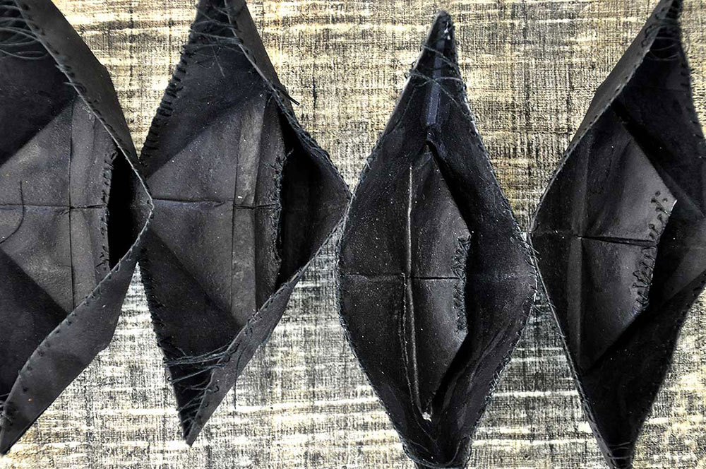 Papierboote, gefalzt, genäht, gesalzen, mit Asche und Kohle bemalt