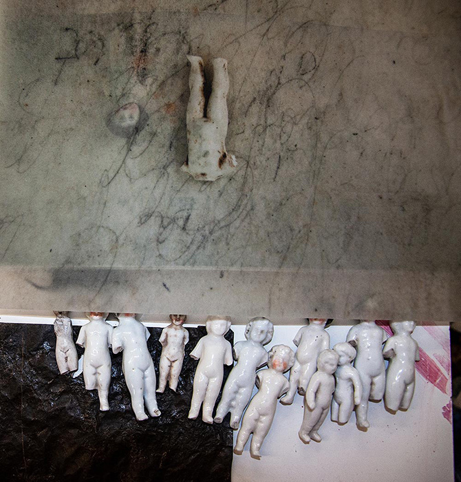Bristolkarton, Transparentfolie und Kohlepapier bedruckt, Keramikfiguren