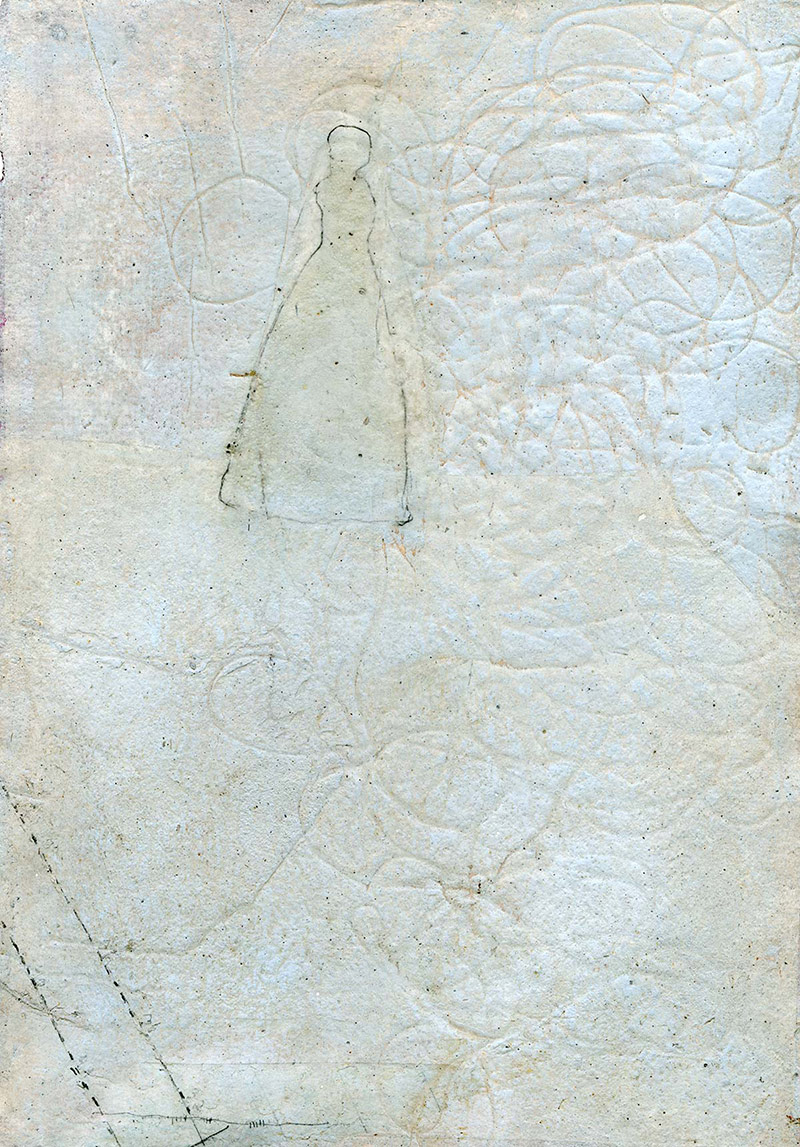 aus gleichnamiger 12-teiligen Serie, Pigmente, Marmor, Alabaster und Quarzmehl, Salz, transparente Papiere, Grafit, Baumwollgarn, Wachs und Acryl auf Papier, 29,7 cm x 21 cm