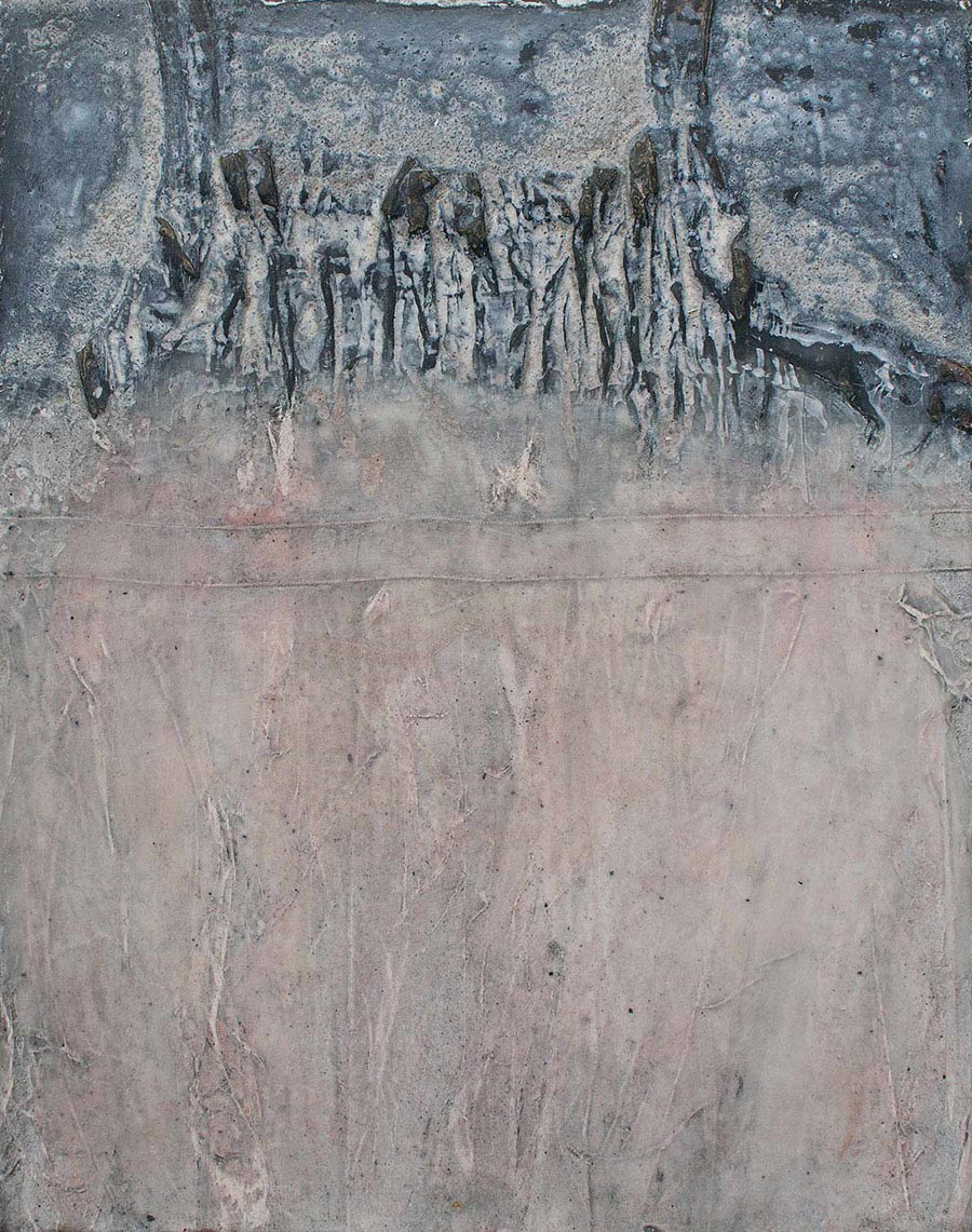 Pigmente, Bleistiftton, japanische Awagami-Papiere, Baumwolle, Schieferkohle, Wachsguss und Acryl auf Leinwand, 35 cm x 27 cm x 4 cm