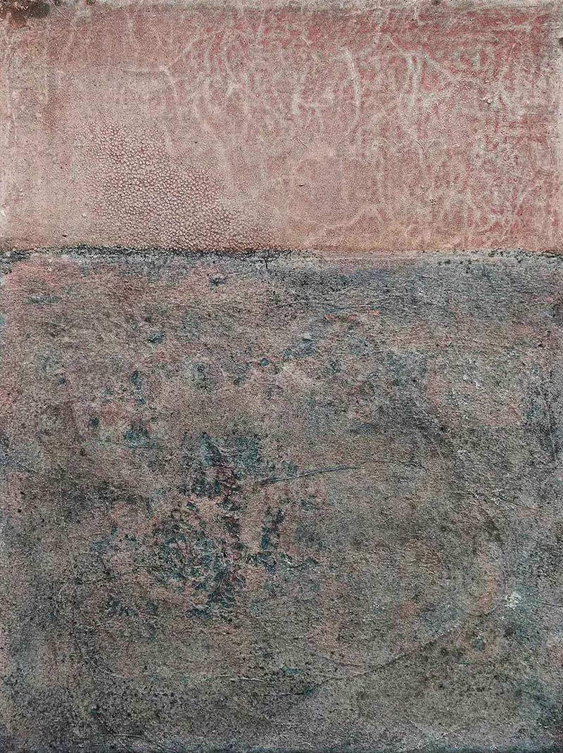 Pigmente, Granit - und Specksteinmehl, Flachs, Kohle, Awagami-Papier, Salz und Acryl auf Leinwand, 40 cm x 30 cm
