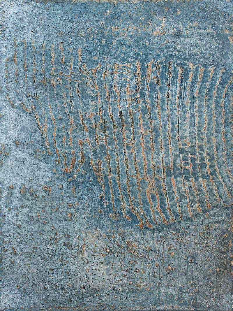 Pigmente, Plastik, Japanpapier, Grafit, Wachs und Acryl auf Leinwand, 40 cm x 30 cm