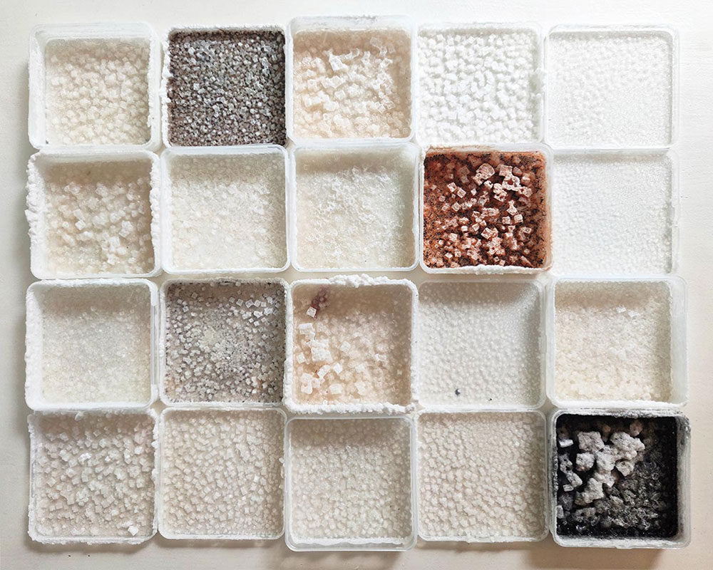 2021, Kristallisation von Meersalz mit Mineralien in Kunststoffkästen, je 9,5 cm x 9,5 cm