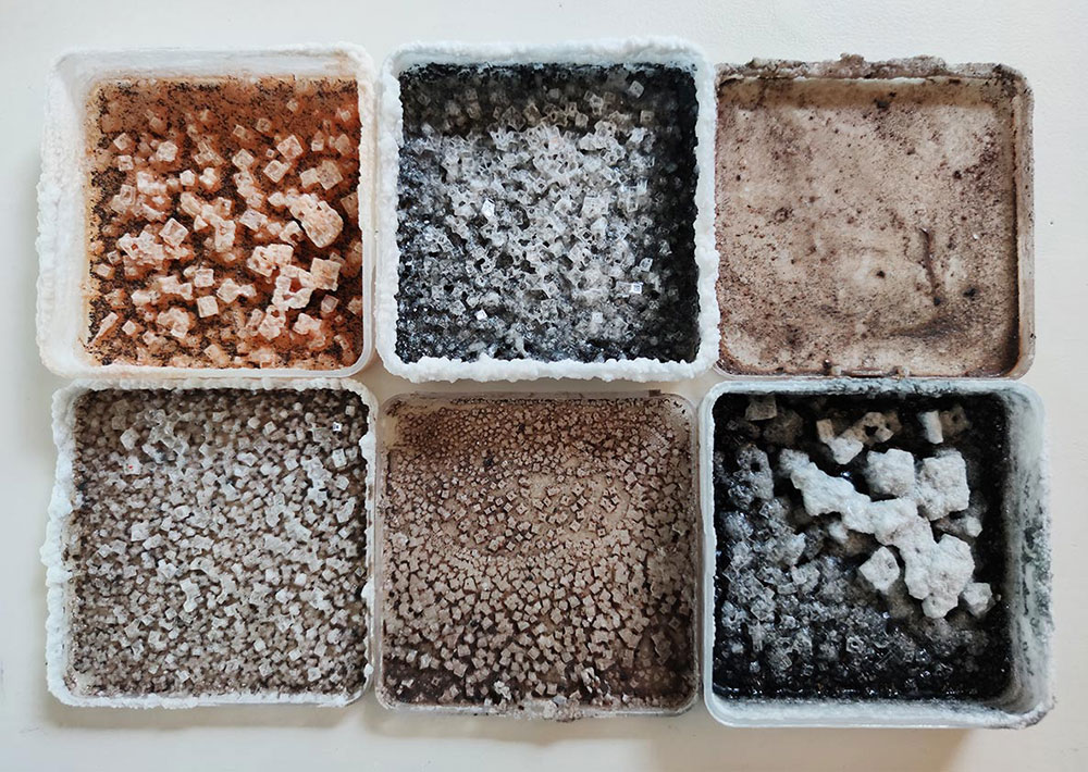 2021, Kristallisation von Meersalz mit Mineralien in Kunststoffkästen, je 9,5 cm x 9,5 cm